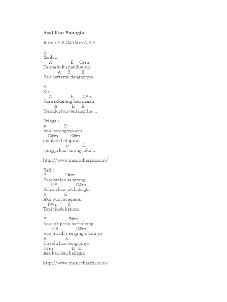 Lirik dan chord gitar asal kau bahagia, armada /tangkapan layar. A b e kau bertemu dengannya E a b c#m yank kemarin ku melihatmu F g am rasa sekarang kau masih f g c memikirkan. Rasa sekarang kau masih memikirkan tentang dia. C d g kau bertemu dengannya. A b g# c#m a b e. A b g# c#m a b e. intro f g e am f g c c f g am yank. G c d em ku rasa sekarang kau masih F g e am f g c c f g am yank. Kemarin ku melihatmu kau bertemu dengannya. Chord "asal kau bahagia" dari grup musik armada. Kemarin ku melihatmu f g c kau bertemu dengannya. F g am kemarinku melihatmu f g c kau bertemu dengannya. C d g kau bertemu dengannya.